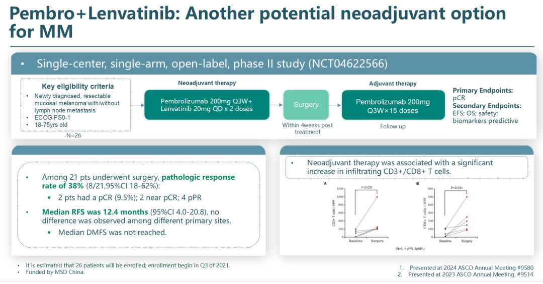在一项单中心、单臂、开放标签的II期研究中,特瑞普利单抗联合阿昔替尼的新辅助靶免治疗显示了积极的治疗活性,缓解率达33.3%(8/24,包括4例pCR和4例pRP),中位EFS为11.1个月,中位OS未达到;探索性分析发现该靶免联合方案可使CD3+和CD3+/CD8+肿瘤浸润淋巴细胞(TIL)显著增加,且TIL与疗效增加相关。另一项单中心、单臂、开放标签的II期研究,使用帕博利珠单抗联合仑伐替尼新辅助治疗MM,pCR率为38%(8/21,包括2例pCR,2例接近pCR和4例pRP),中位RFS为12.4个月。
