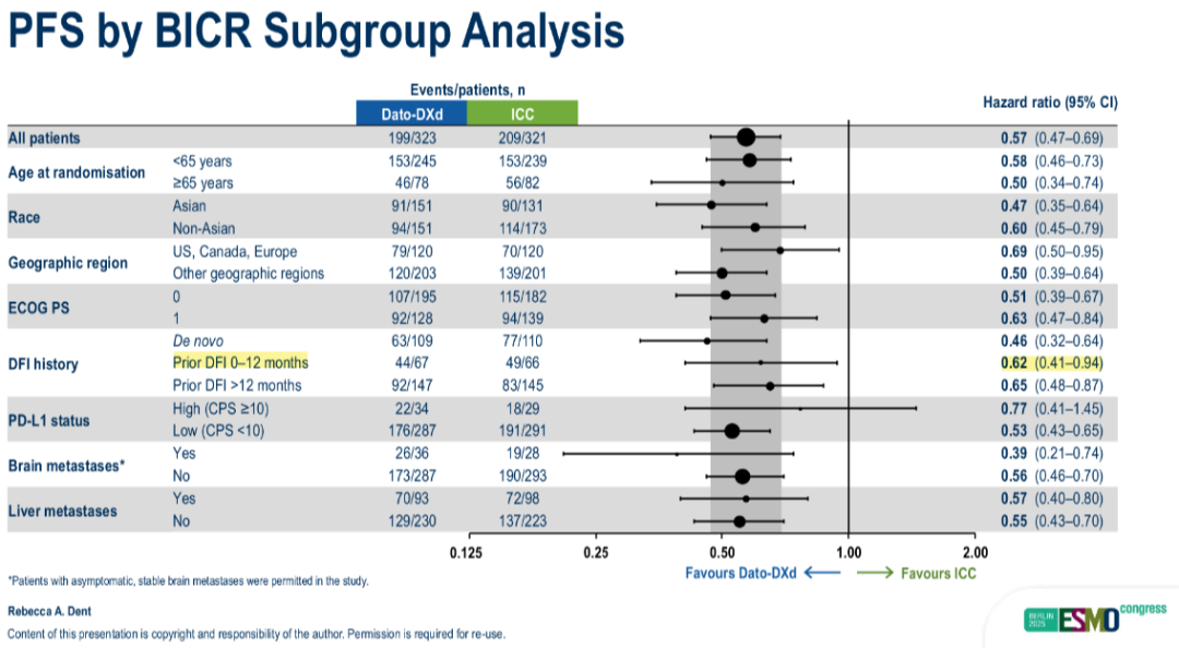较为特别的是,TB-02研究还入组了一部分早期复发患者,即在根治性手术和术后辅助化疗结束后,不足1年即出现复发的患者,既往据我所知,并无治疗此类患者的循证医学证据,因为临床研究并不愿意纳入这类可能对各种治疗应答不佳、预后较差的患者;而TB-02研究入组的早期复发患者约占20%,无病间期(DFI,定义为根治性治疗结束到首次发现局部/远处复发)不足半年的患者占患者总数的15%,且Dato-DXd对此类患者展现了非常好的疗效。