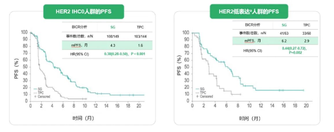 无论 HER2 状态如何,SG在HER2 IHC0和HER2低表达的mTNBC人群的PFS均有显著获益