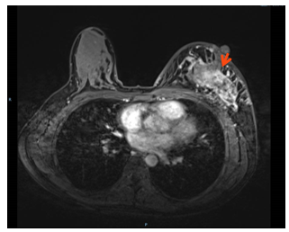 1.乳腺增强MRI:左侧乳腺多发肿块,形态不规则呈分叶状,边缘毛刺,内部呈不均匀混杂强化,病灶最大直径约7.2cm(靶病灶1)。(图1)