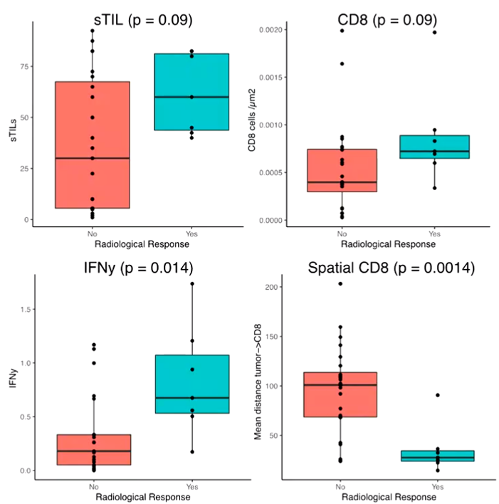 该项研究具有一定的创新性,也很好的应用了新辅助治疗窗这一概念。总体来讲,这项研究为新辅助治疗免疫相关人群及免疫治疗敏感人群的生物标志物判定开辟了新的思路。研究结果提示,基线TILs表达、TIL与肿瘤细胞物理上的距离及IFNγ都有助于预测新辅助免疫治疗的疗效。